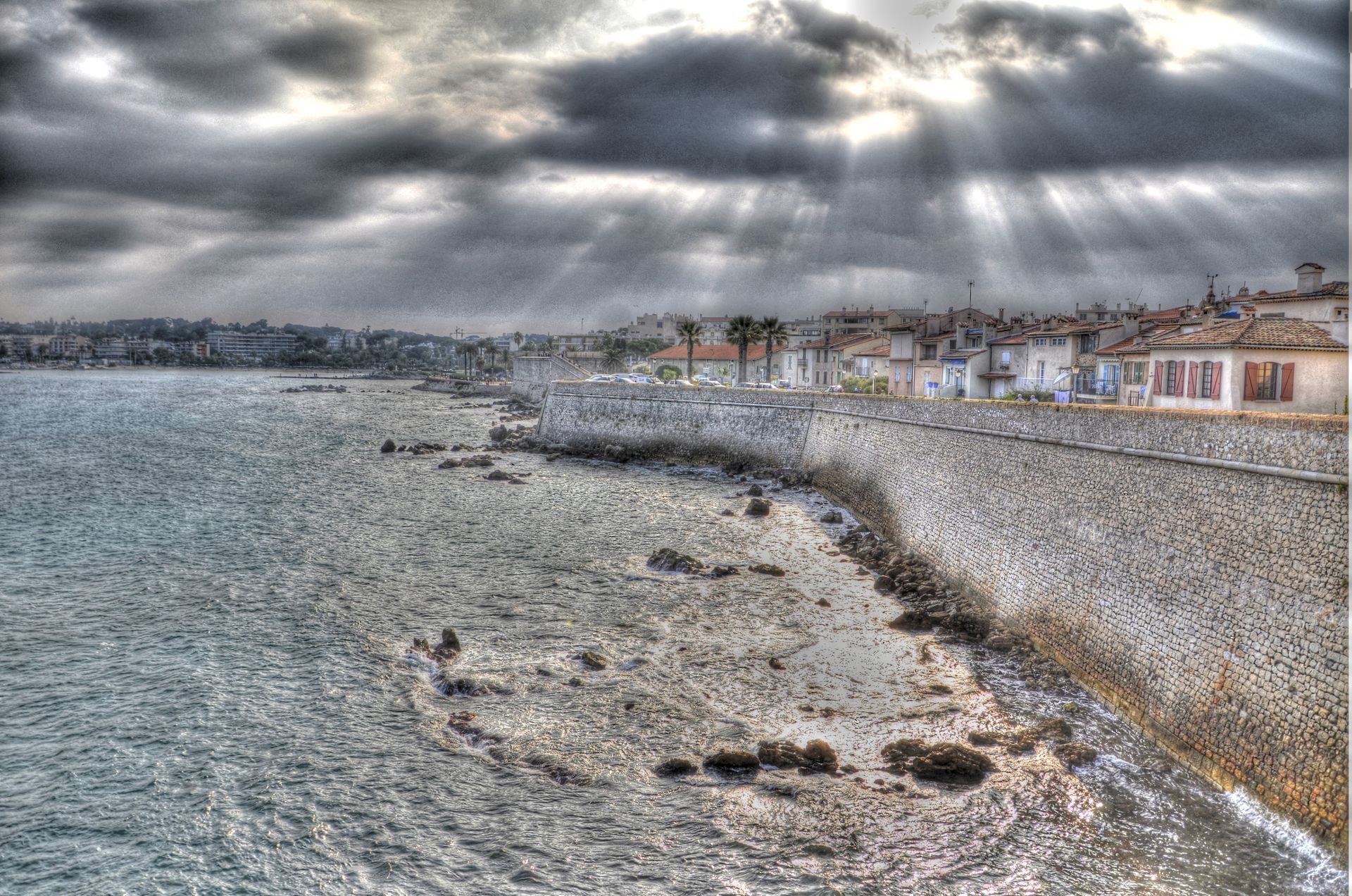 Le circuit ensuite est à votre choix, soit vous montez directement dans les petites ruelles pour les parcourir, soit vous faites le tour en profitant des remparts, je vous conseille plutôt cette solution. En montant, à gauche la rue longeant ces remparts. Vous y aurez une vue imprenable sur : le port, la côté jusqu’à Nice, la petite plage dont je vous parlais au début, le cap, que l’on verra par la suite et bien évidemment les appartements, le musée Picasso et ces bâtisses solides aux vieilles pierres, pour résister aux assauts du vent marin.